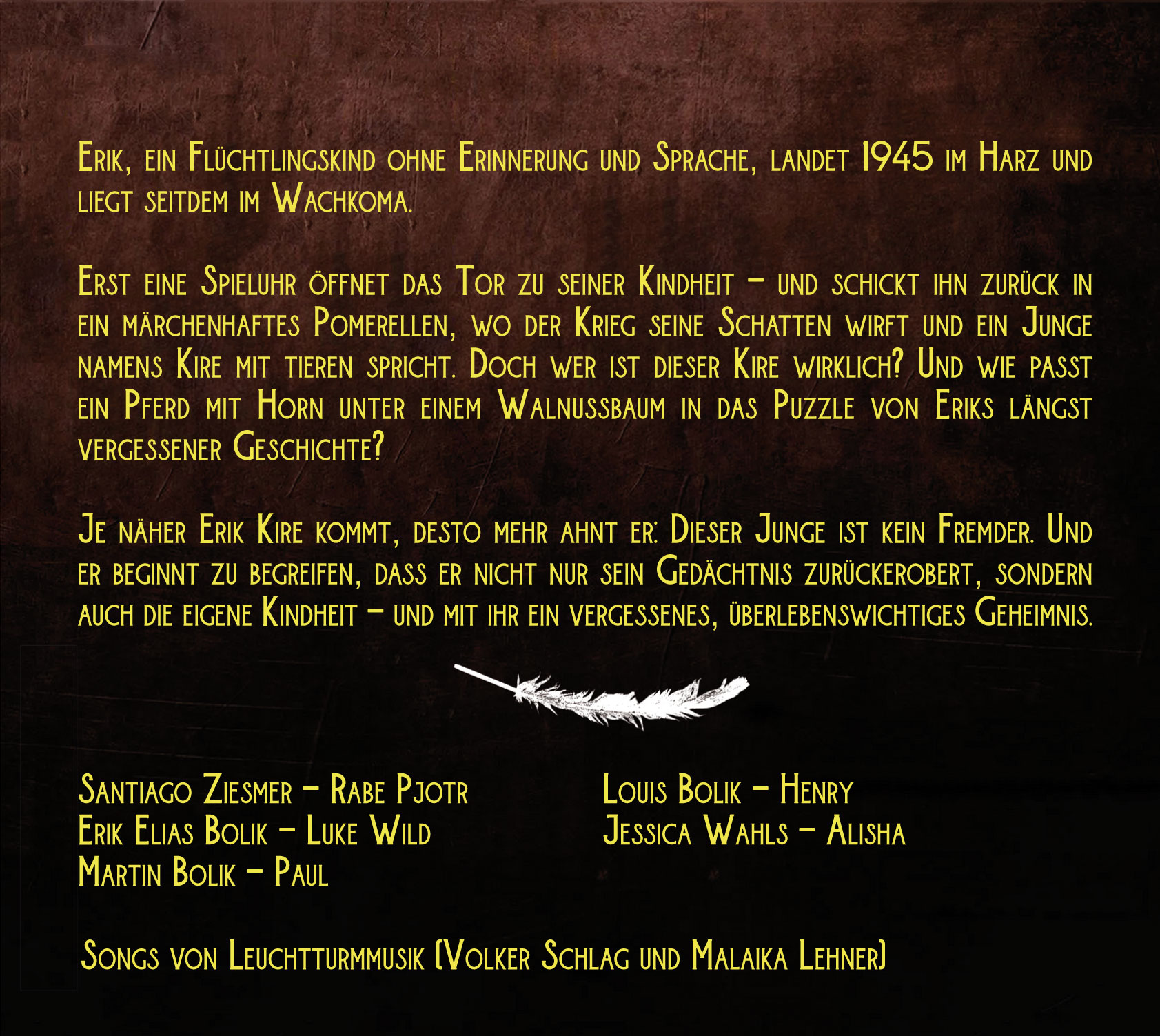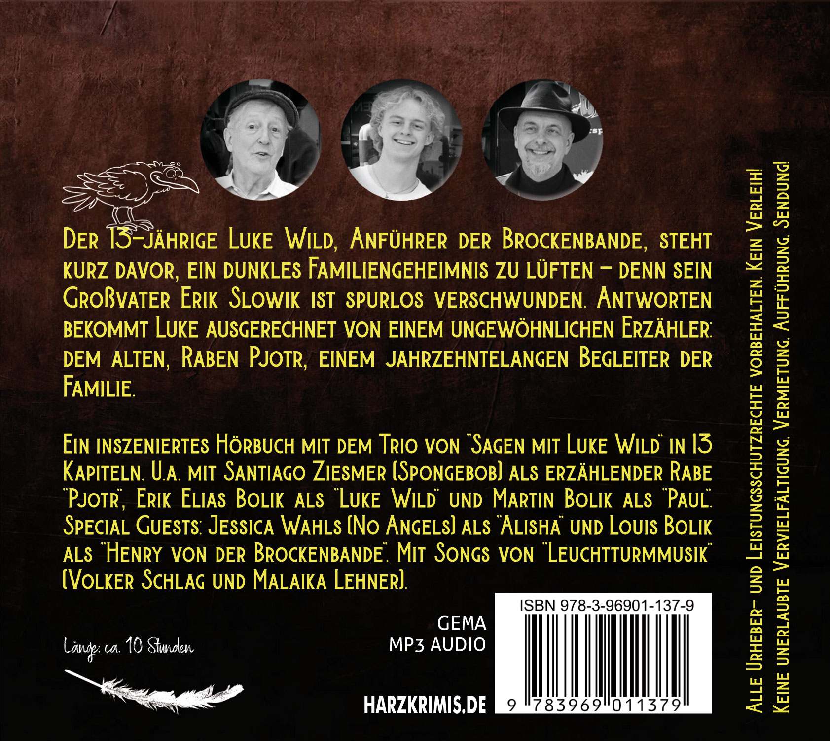Ein inszeniertes Hörbuch mit dem Trio von ”Sagen mit Luke Wild“ in 13 Kapiteln, u.a. mit Santiago Ziesmer (SpongeBob) als erzählender Rabe ”Pjotr“, Erik Elias Bolik als ”Luke Wild“ und Martin Bolik als ”Paul“. Special Guests: Jessica Wahls (No Angels) als ”Alisha“ und Louis Bolik als ”Henry von der Brockenbande”. Mit Songs von ”Leuchtturmmusik“ (Volker Schlag und Malaika Lehner).